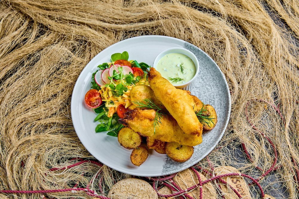Krõbedas paneeringus meritint kartuli, bimi, värviliste porgandite ja tartar kastmega.