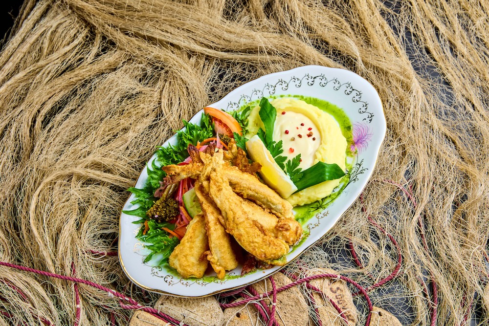 Tempura taignas meritint Nurmeotsa talu suitsukalaleiva, Mumi soolakurgi, tartarkastme ja kalamarjaga.