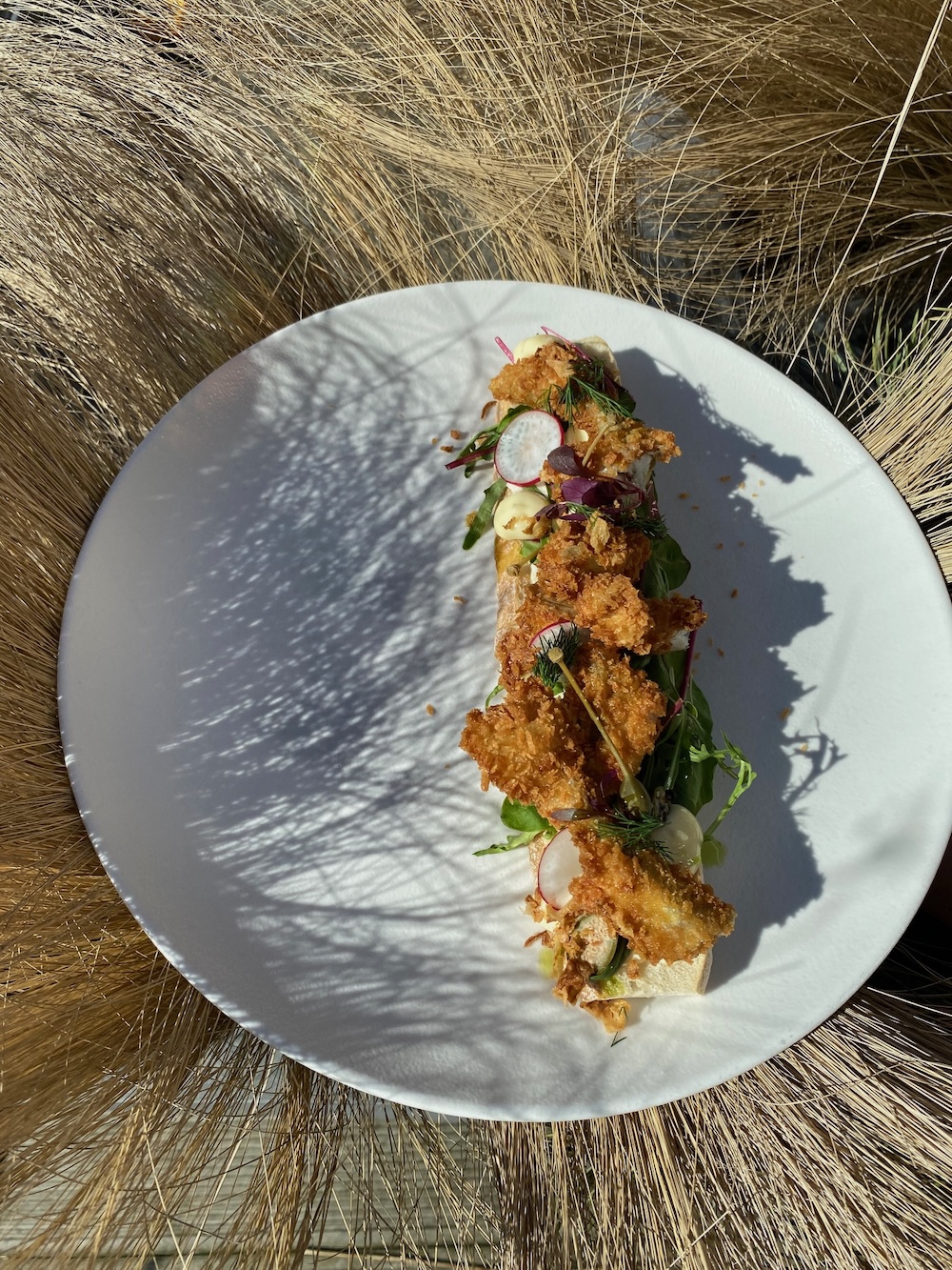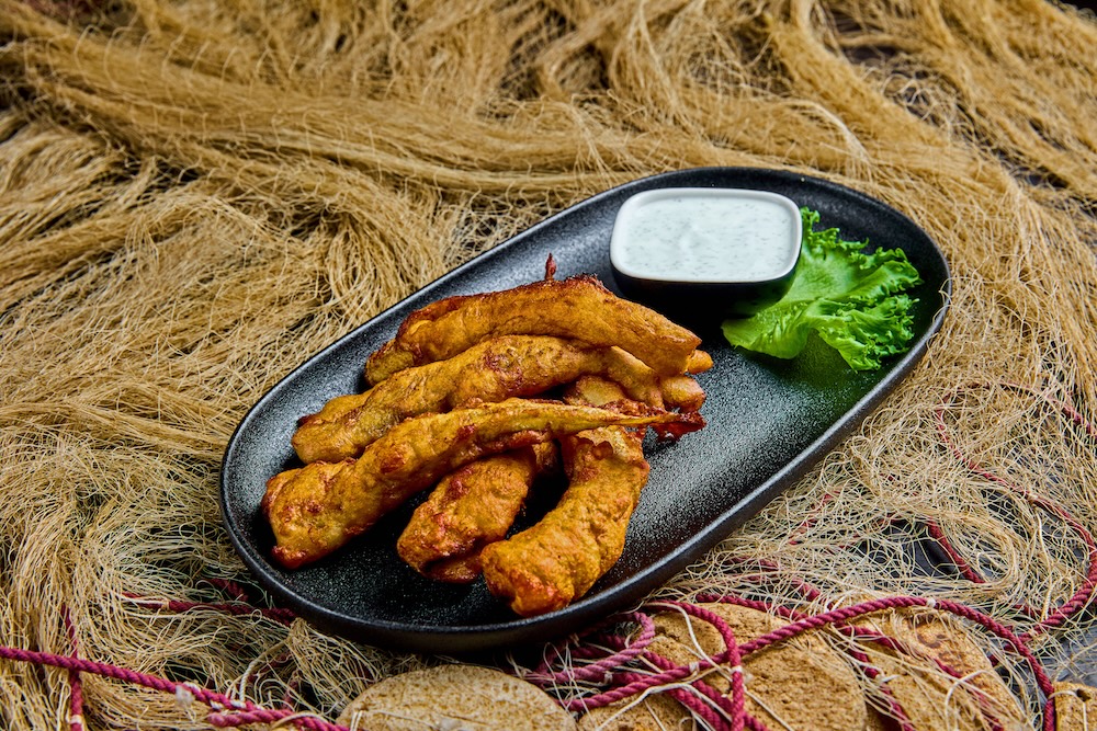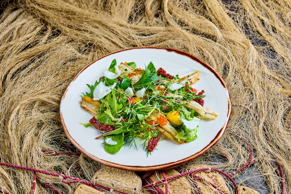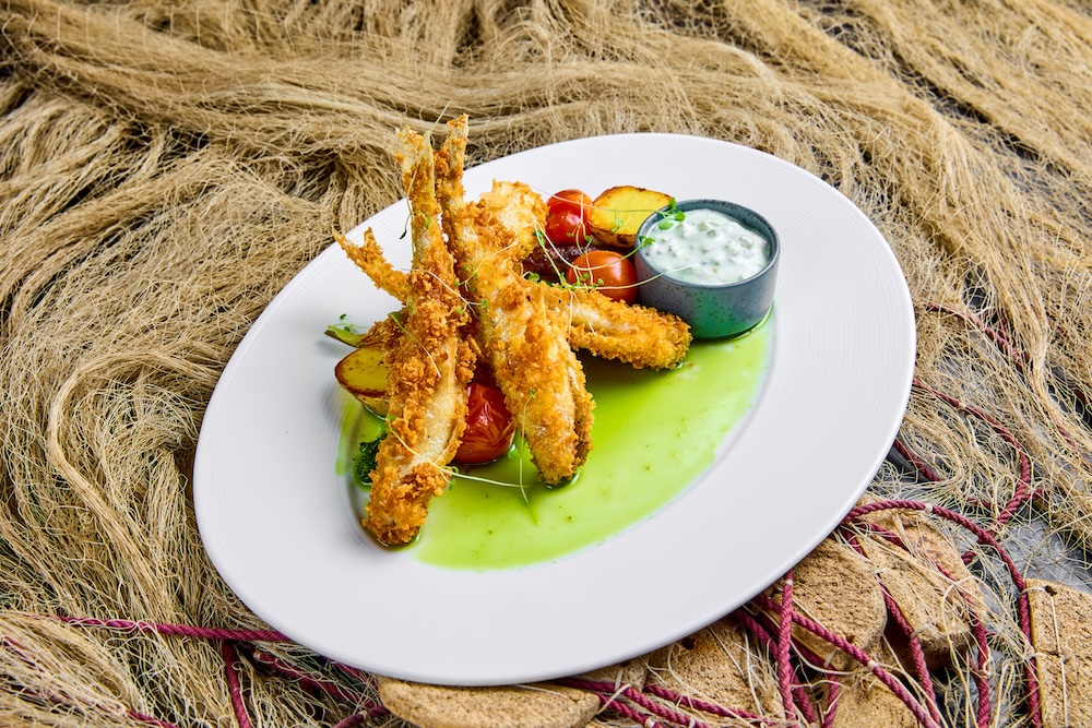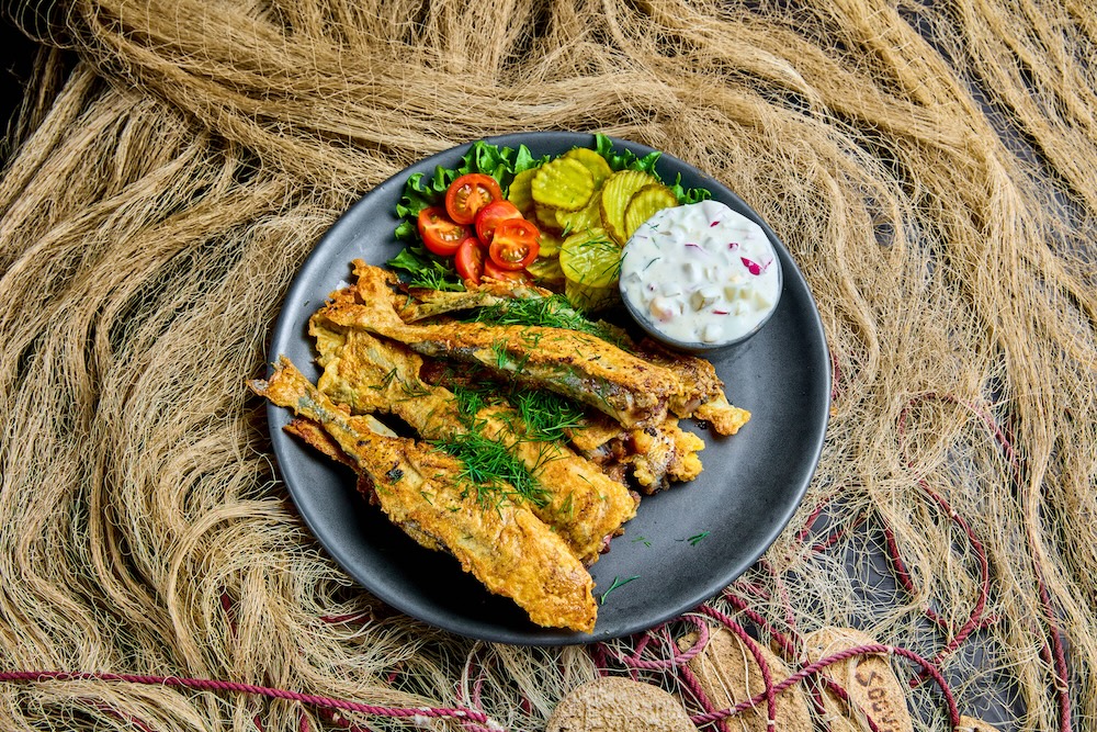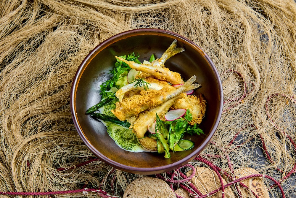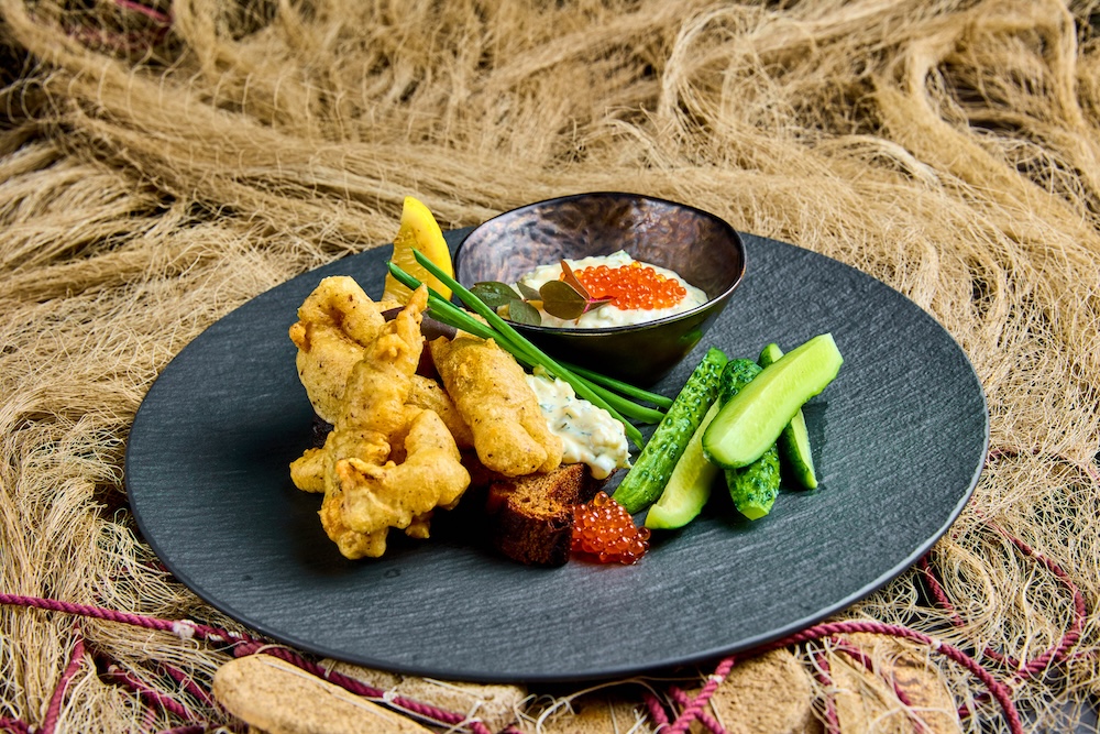 Tempura taignas meritint Nurmeotsa talu suitsukalaleiva, Mumi soolakurgi, tartarkastme ja kalamarjaga.