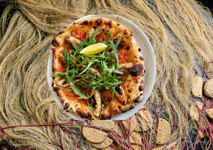 Suitsutatud meritindi ja kimchi pitsa.