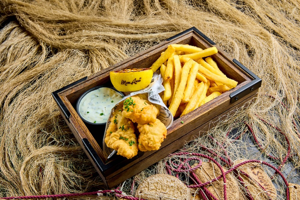 Krõbedas paneeringus meritint kartuli, bimi, värviliste porgandite ja tartar kastmega.
