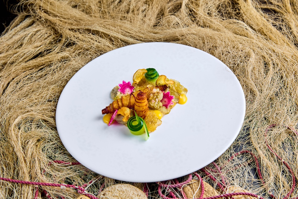 Võiga praetud meritindifilee. Kartuli croissant, maapirn, kurk ja haugimari.